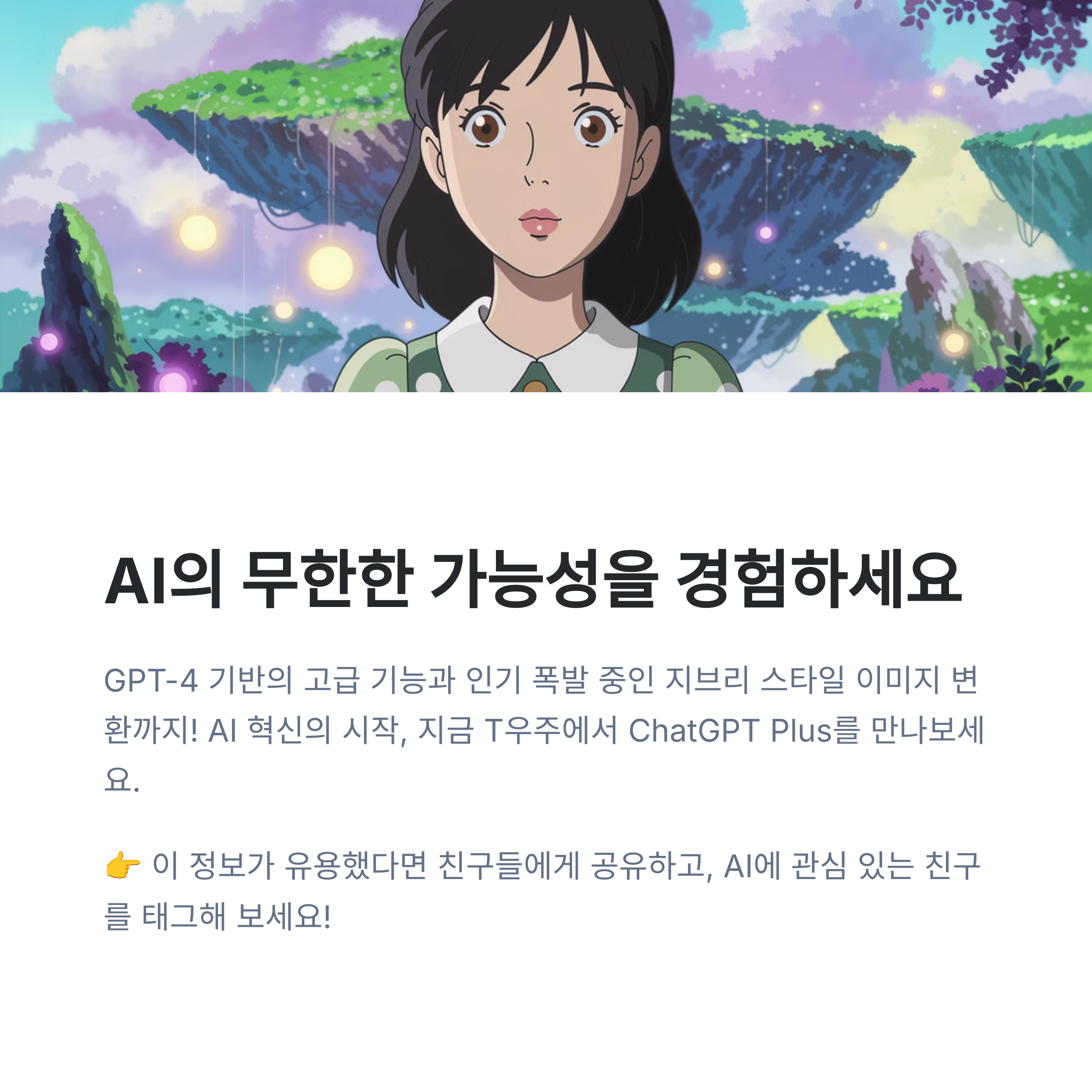실제 사용자들의 경험담SNS와 커뮤니티를 중심으로, 이번 T우주 할인 이벤트를 통해 ChatGPT Plus를 체험한 사용자들의 후기가 속속 올라오고 있어요. 특히 '지브리 스타일 이미지'를 만들어주는 DALL·E 기능이 큰 인기를 끌고 있습니다. 어떤 분은 여행 사진을 애니메이션 풍으로 바꾸고, 어떤 분은 자기 강아지를 캐릭터처럼 재현했다고 하더라고요. 게다가 GPT-4의 데이터 분석 기능을 통해 졸업 논문을 작성하는 데 도움을 받았다는 대학생의 후기까지... 단순히 재미뿐 아니라 실용성까지 챙길 수 있다는 게 이 서비스의 매력이에요.할인 혜택을 최대한 활용하는 팁ChatGPT Plus를 제대로 활용하려면 단순히 가입만 해서는 안 되죠. 아래에 정리한 팁들을 통해 3개월 동안 AI의 세계를 최대한 누려보세요.