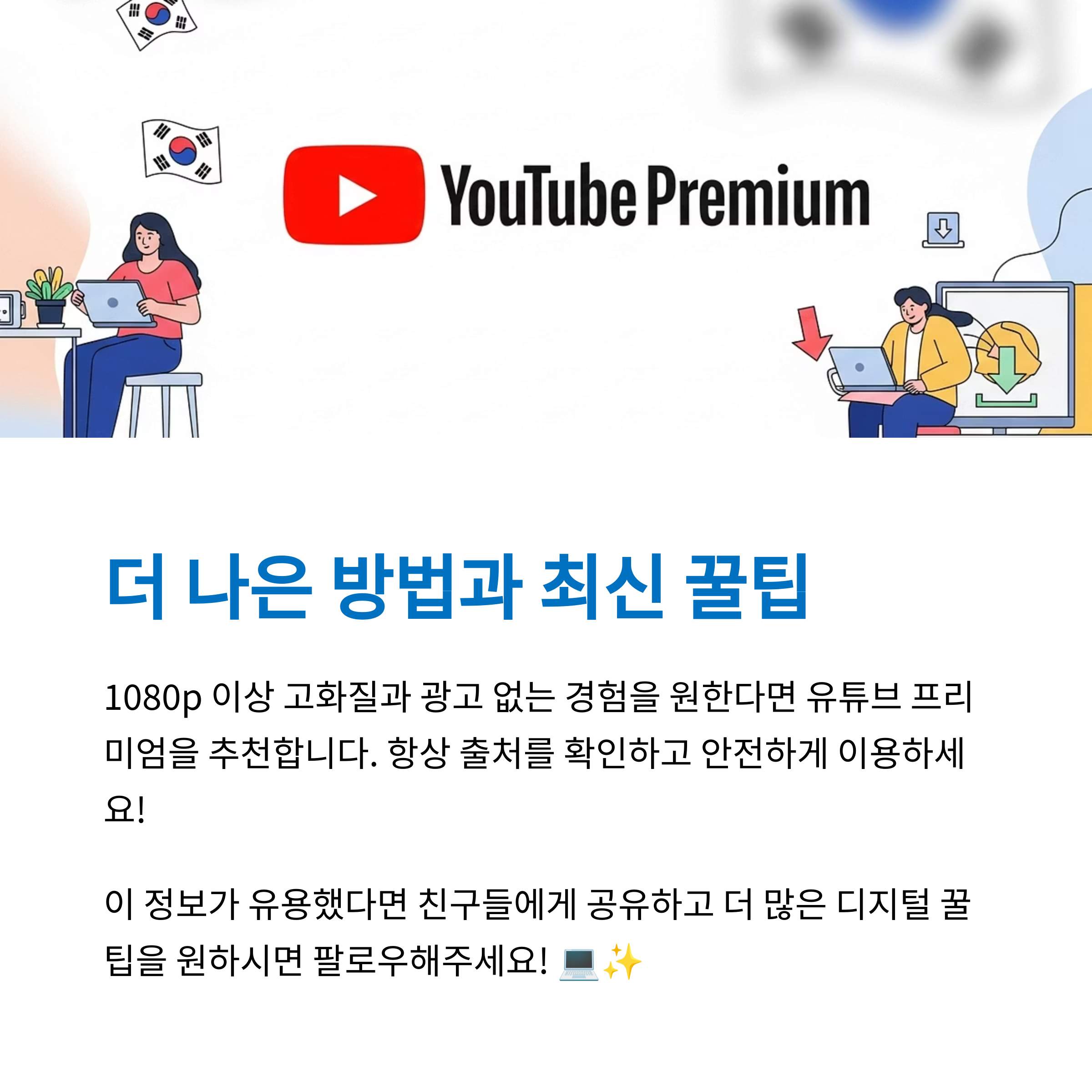YouTube++ 플러그인, 4K Video Downloader 같은 유료/설치형은 광고 없이 고화질, 음성 추출(자막 포함) 지원.