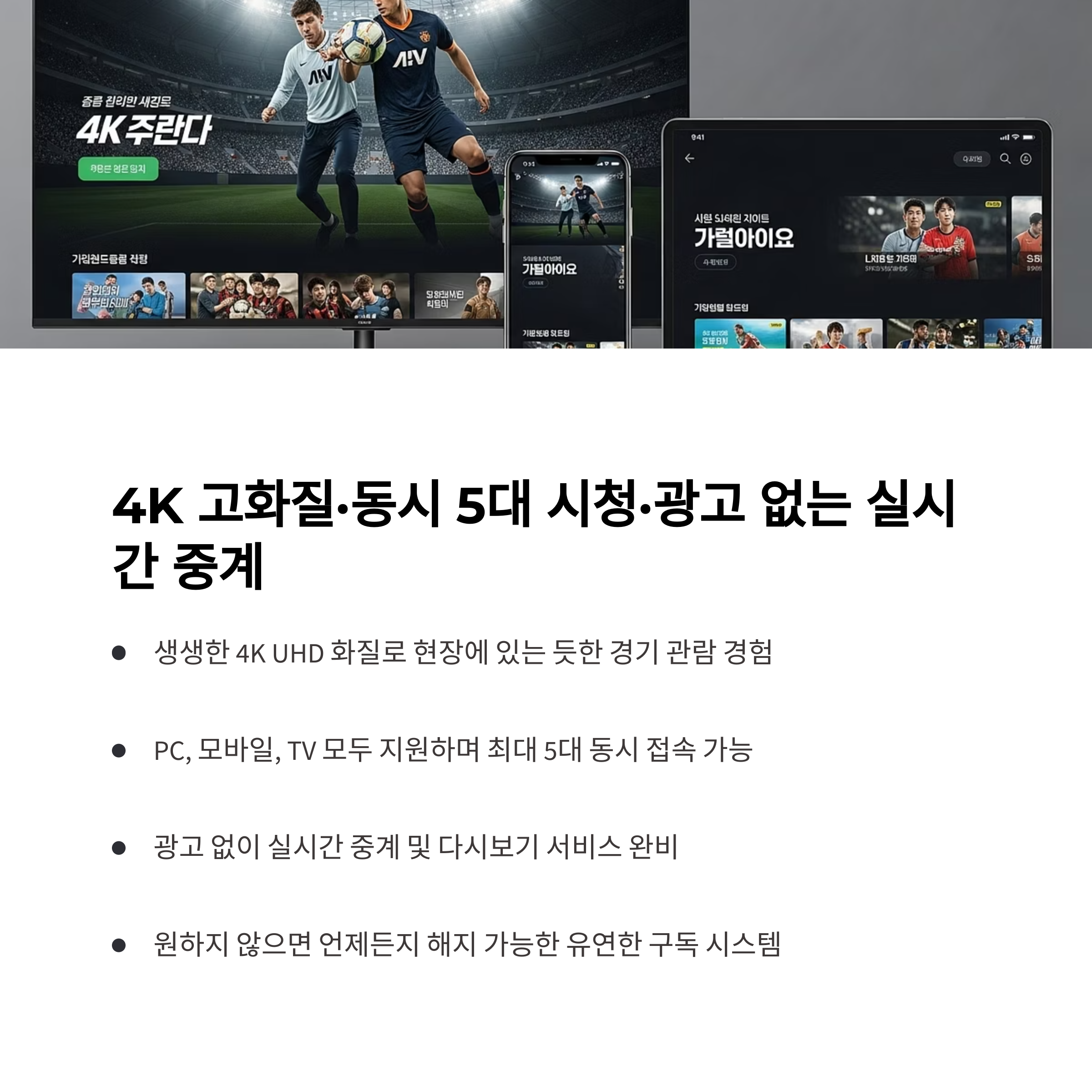 | 시청 가능 콘텐츠 | K리그, 국가대표 경기 등 일부 무료 | EPL, NBA, AFC 등 프리미엄 전 경기 |