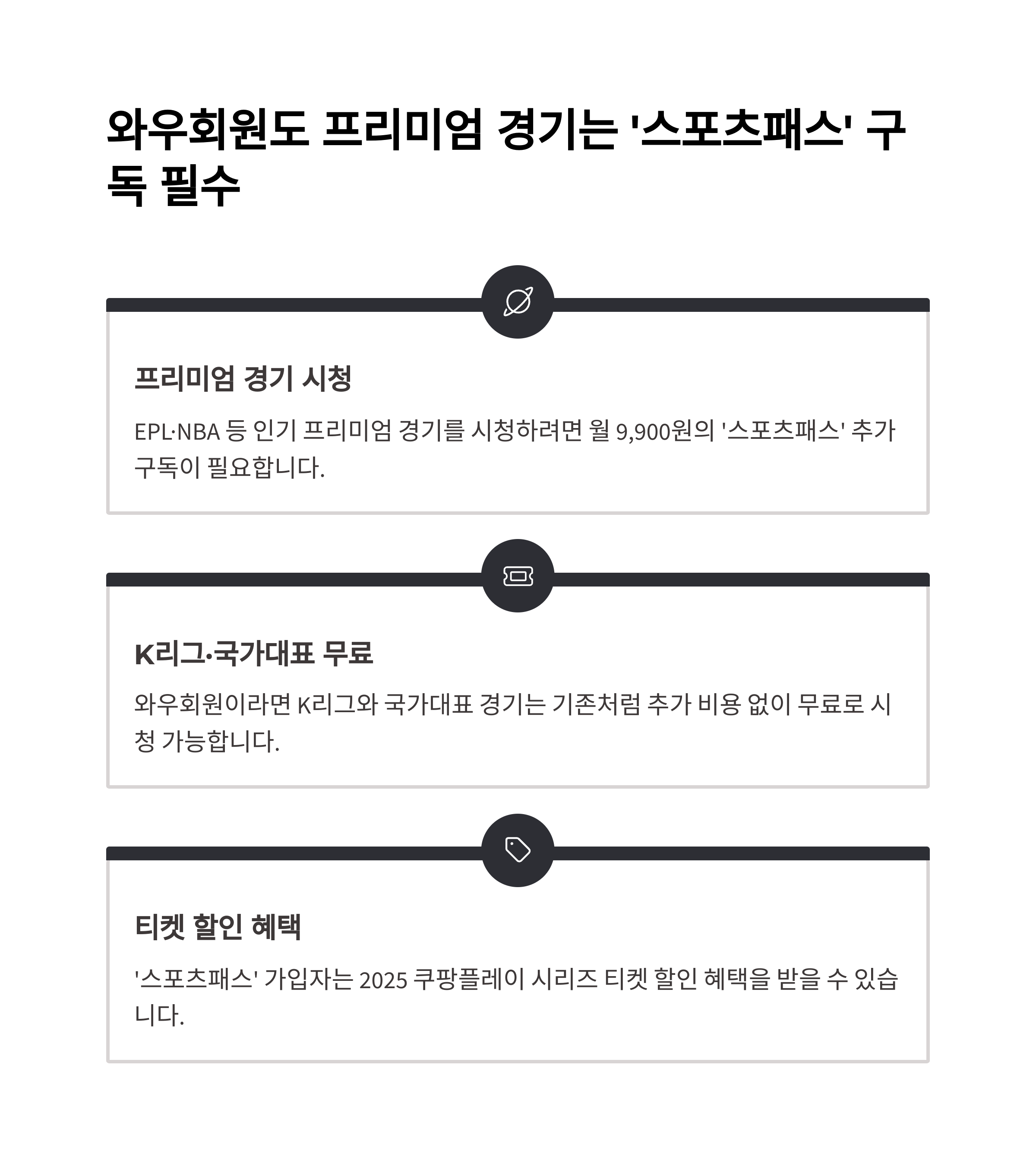 | 와우회원 혜택 | 무료 중계, FHD, 광고 있음 | 4K, 무광고, 스포츠패스 필요 |