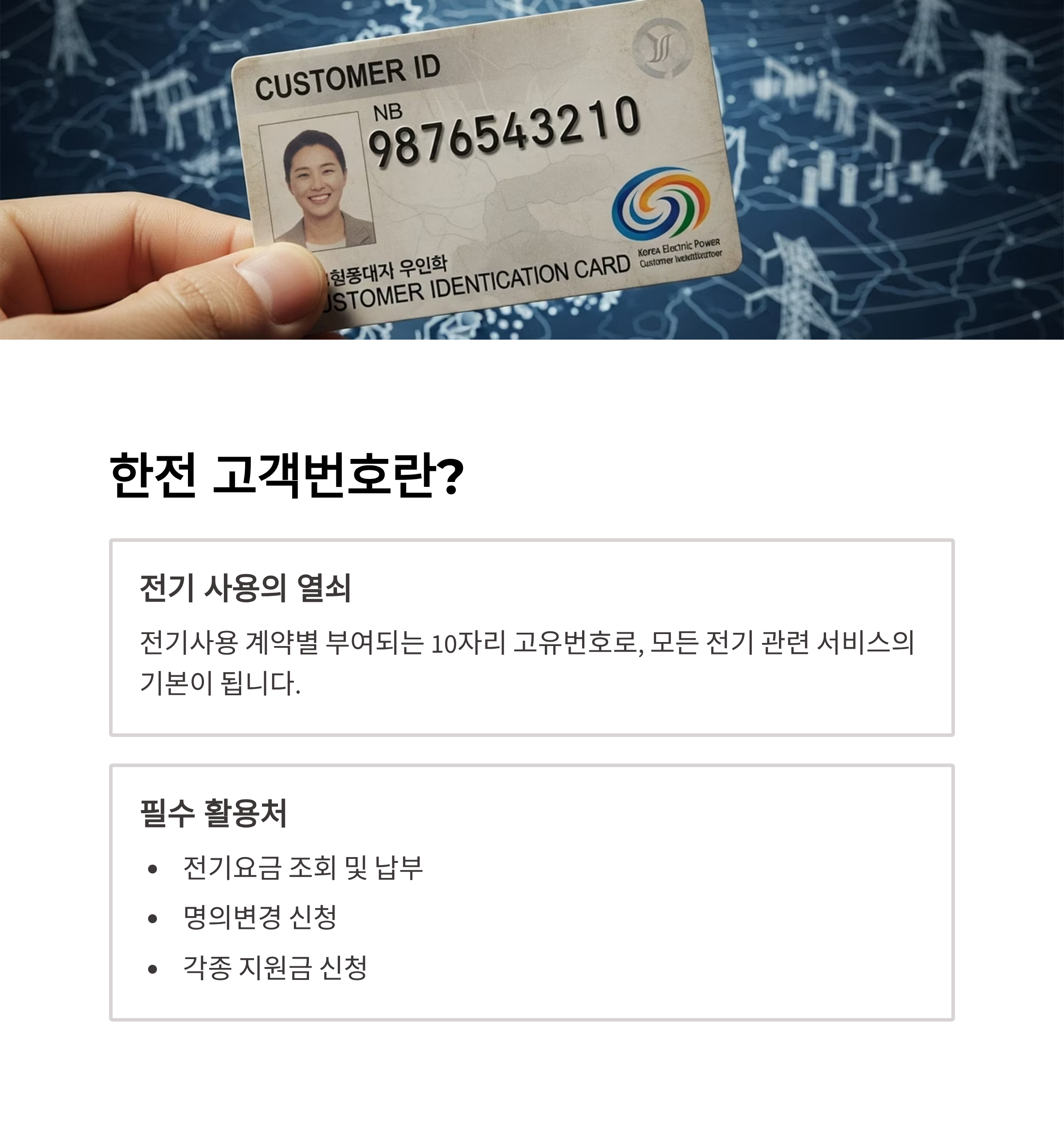 한전 고객번호는 전기요금 조회·납부·명의변경·자동이체 등 모든 전력 서비스를 이용할 때 필수로 요구되는 고유 식별번호입니다. 계약 주소와 명의별로 부여되며, 이사·명의변경 시 신규 번호가 적용됩니다.