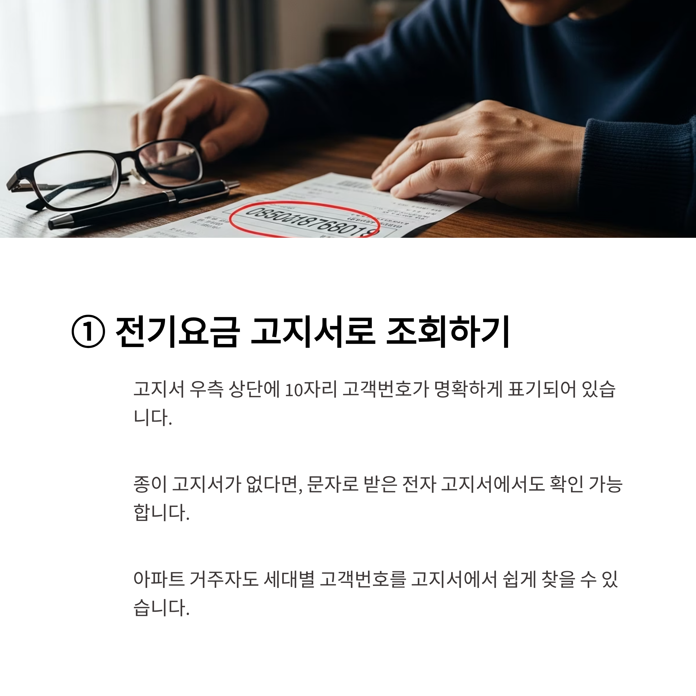 한전 ON(사이버지점/앱) 또는 고객센터에서 주소+동·호만 입력하면 세대 계약번호를 바로 확인할 수 있습니다.