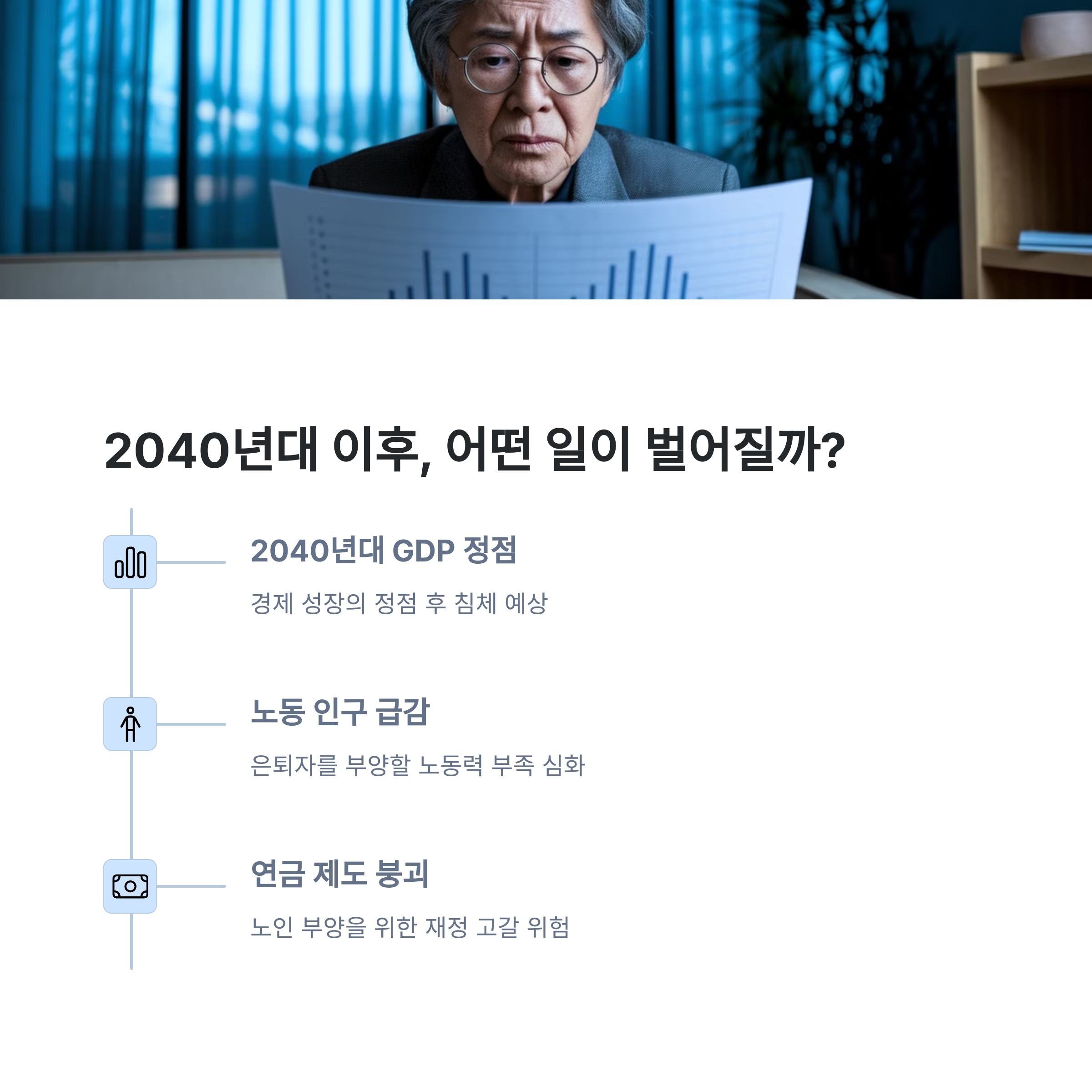 영상에서 가장 충격적이었던 부분 중 하나는 바로 '2040년대 GDP 정점' 이후의 경제 시나리오예요. 일단 경제가 정점에 도달하면, 생산인구가 줄어들기 시작하면서 세금 수입도 줄고 소비도 위축돼요. 그리고 그 다음이 문제죠. 노년층이 전체 인구의 절반 가까이를 차지하게 되면, 일하는 사람들이 내는 세금으로는 연금이나 의료복지 비용을 감당할 수 없게 됩니다. 이게 말 그대로 시스템 붕괴로 이어질 수 있다는 거예요.