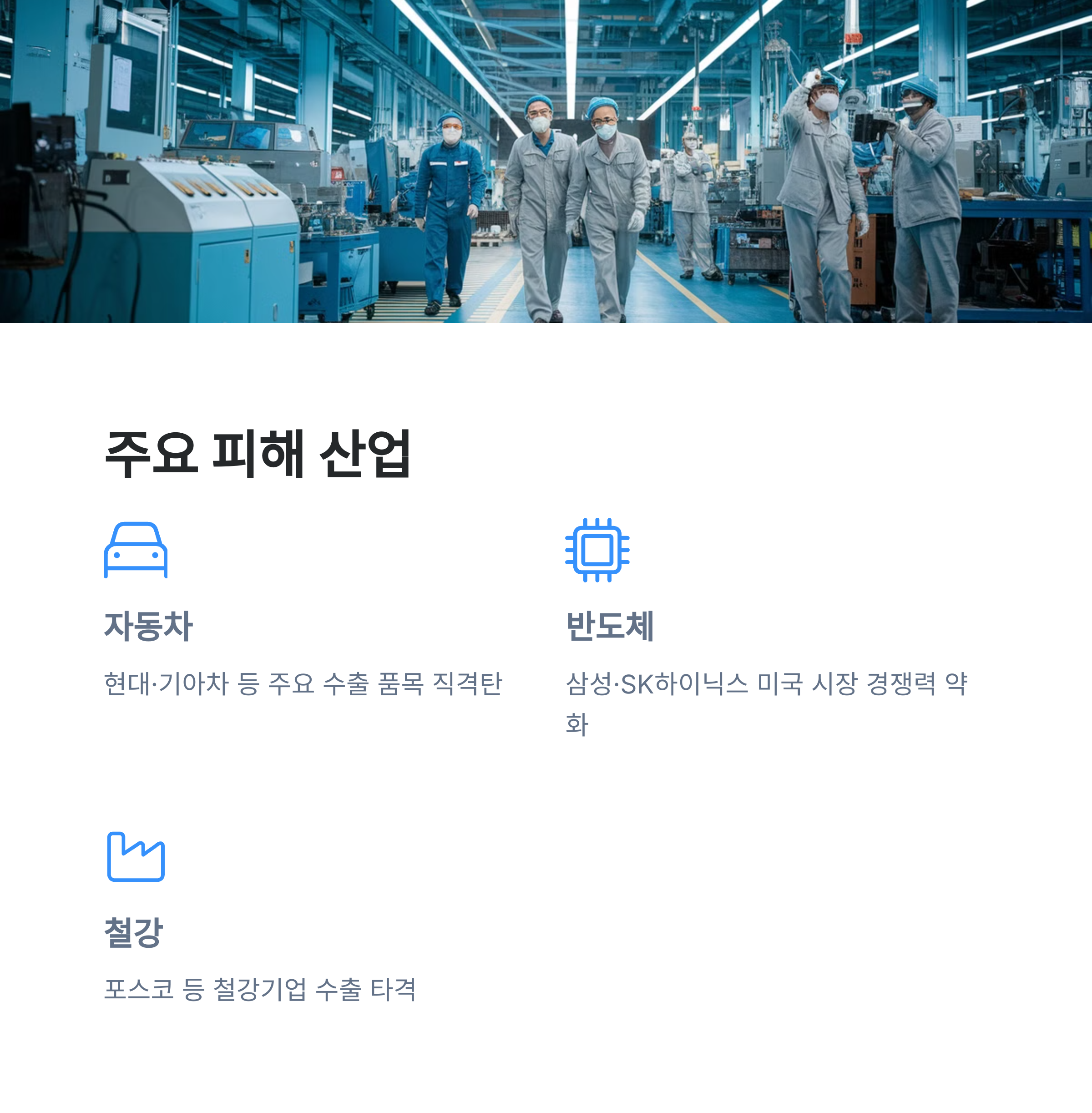 이번 조치의 가장 큰 타격은 단연 한국의 주력 수출 품목에 집중돼 있습니다. 자동차, 반도체, 철강 — 이 세 분야는 미국 수출 비중이 크고 글로벌 경쟁도 치열한 영역이죠. 특히 완성차는 미국 내 조립 비중이 높아 그동안 관세를 피할 수 있었는데, 이제는 그 우위도 무너질 가능성이 있습니다.
